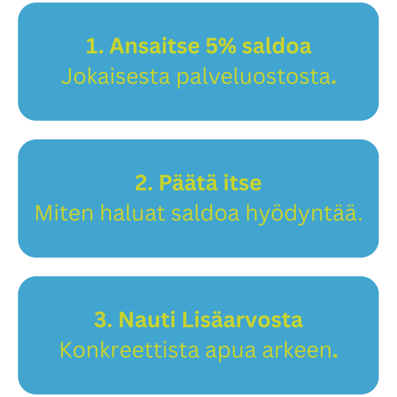 Järjestelmä on yksinkertainen ja tasa-arvoinen: kun asiakas käyttää sopimusasiakkaana palveluita, hän kerryttää viisi (5) prosenttia maksamistaan kuluista suoraan omalle Hyvinvointitililleen. Esimerkiksi 300 euron palveluostos säästää tilille jo 15 euroa.